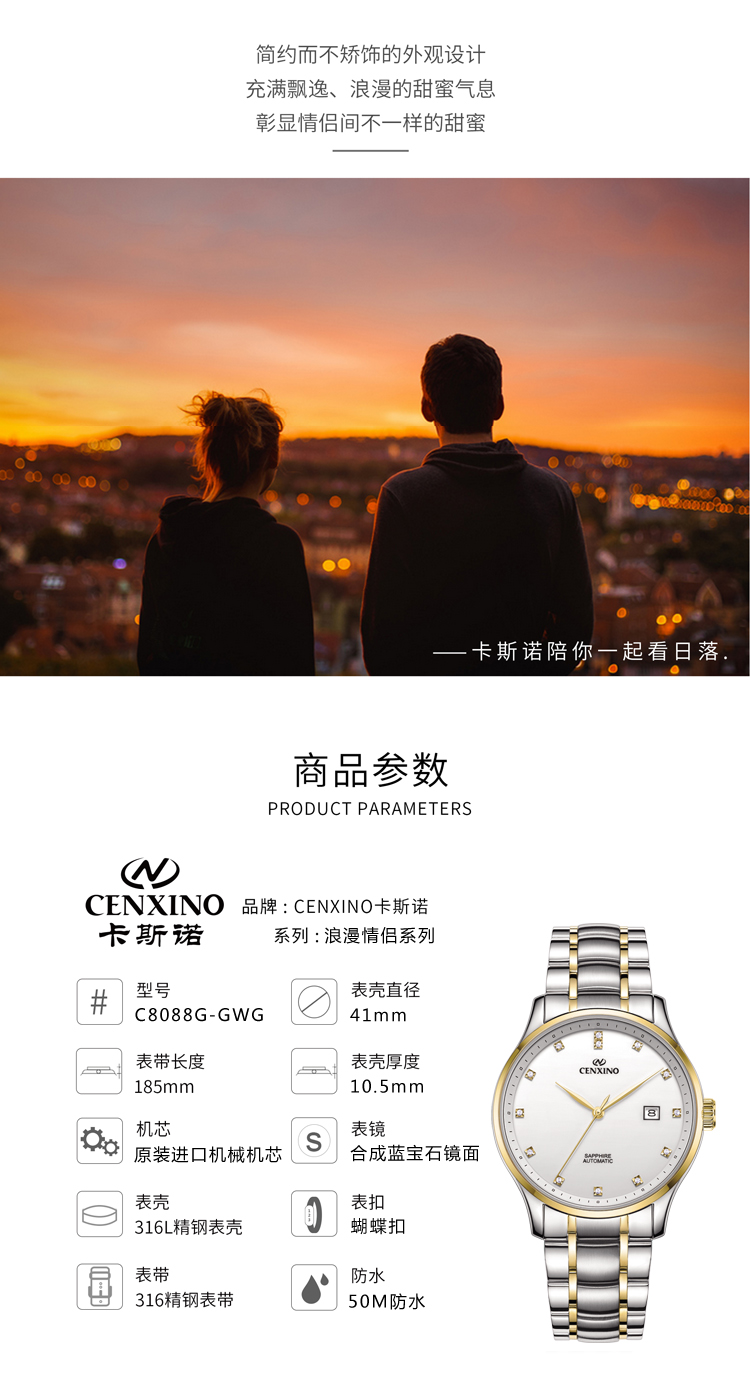 卡斯诺(CENXINO)|男表,-卡斯诺(CENXINO)浪漫情侣系列机械男表(C8088G-GWG)