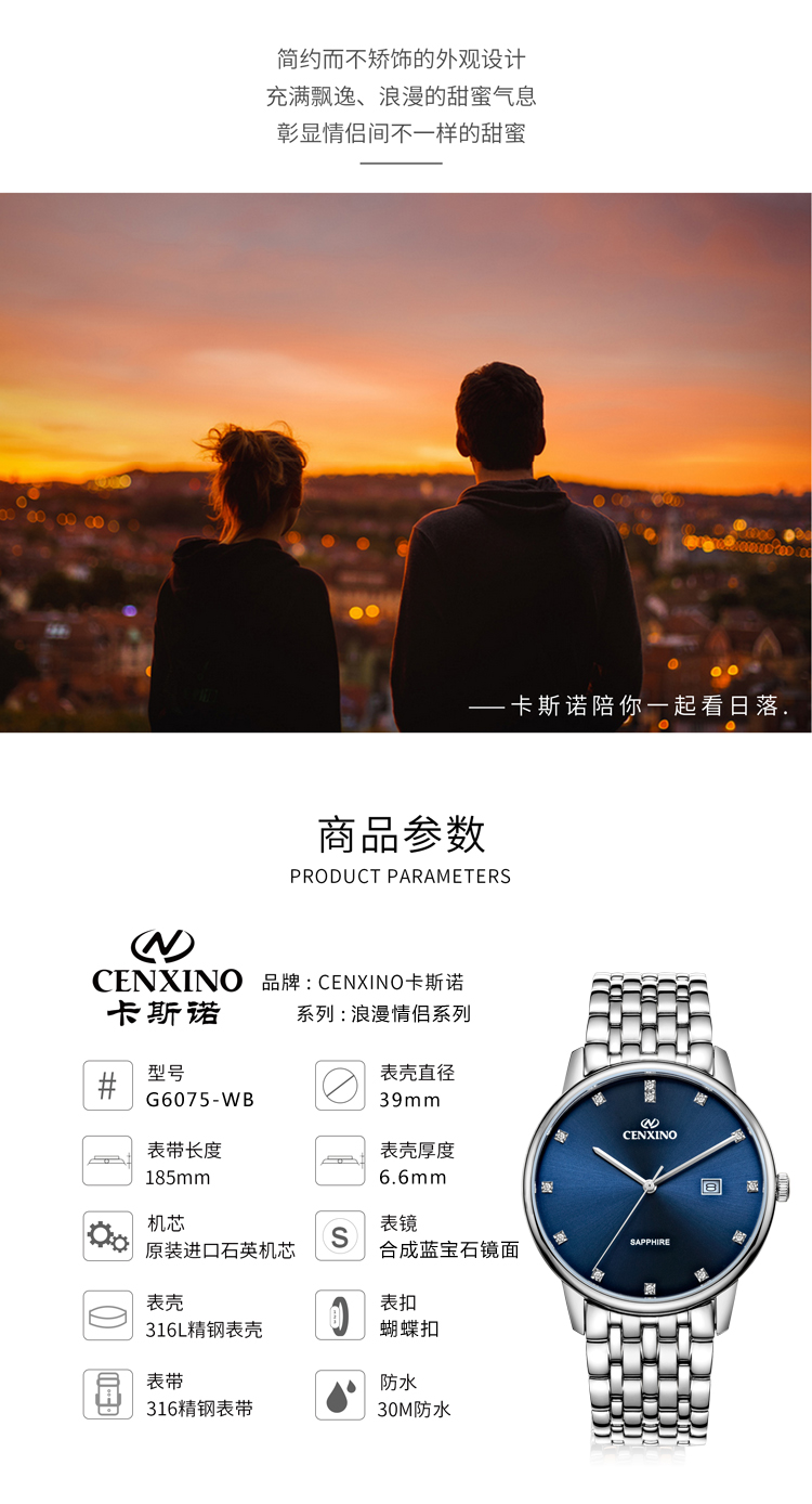 卡斯诺(CENXINO)|男表,-卡斯诺(CENXINO)浪漫情侣系列石英男表(G6075-WB)